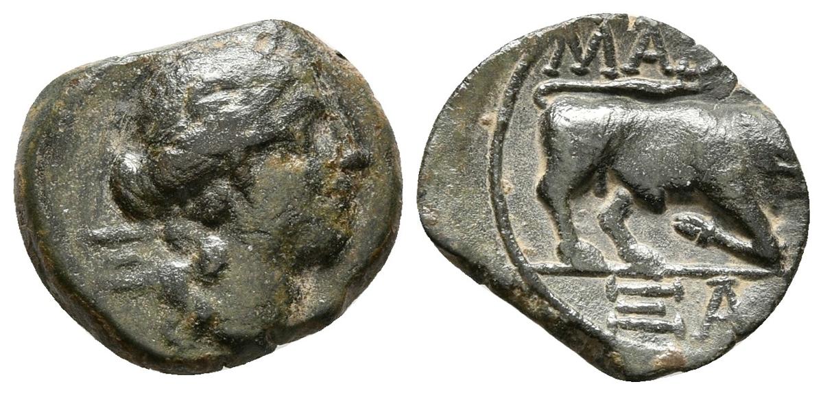 MASSALIA-GALIA. ¿Hemióbolo? 100-170 a.C. Marsella (Francia). A/ Cabeza de Apolo a derecha, detrás M. R/ Toro embistiendo a derecha, MASSA y en exergo SA. LT 1673 var. Ae. 1,60g. MBC.