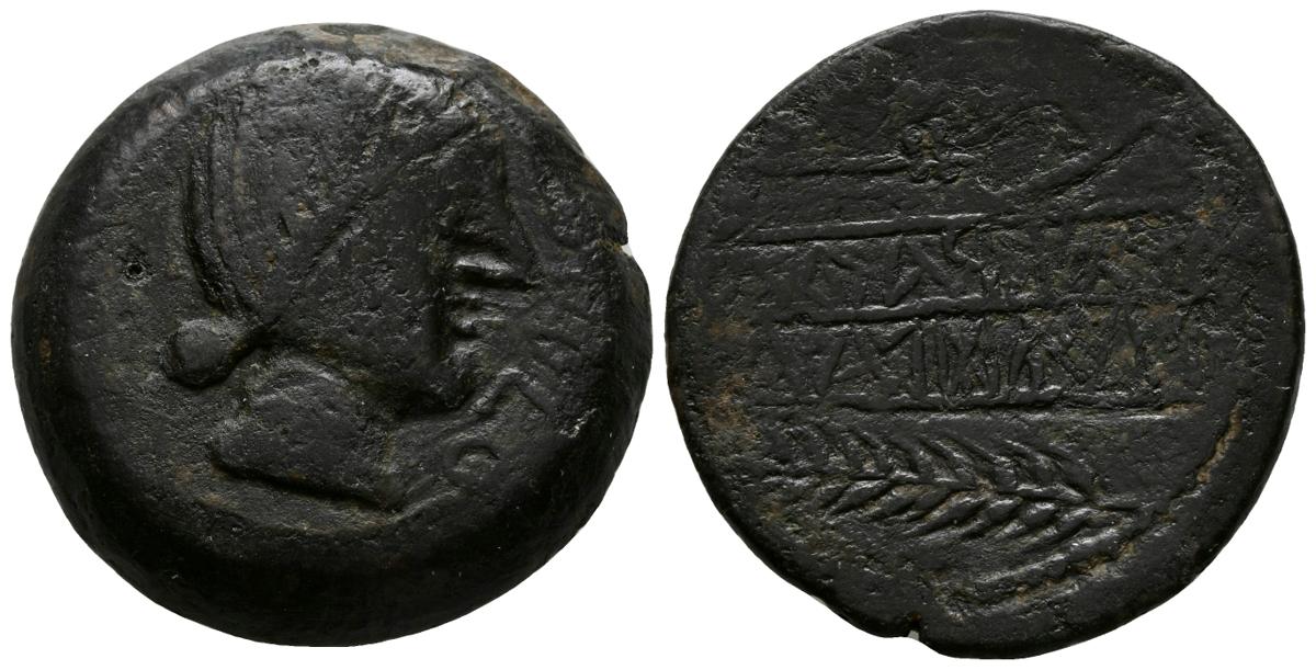 OBULCO. As. 220-20 a.C. Porcuna (Jaén). A/ Cabeza femenina con collar a derecha, delante interna OBVLCO. R/ Arado y espiga a izquierda, entre ellos, leyenda ibérica ISCeRATeN-UIUBoLAI. FAB-1786. Ae. 19,69g. MBC-.