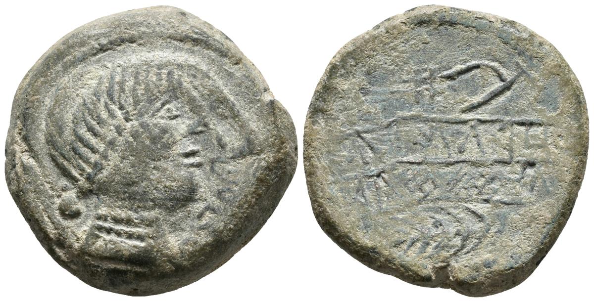 OBULCO. As. 220-20 a.C. Porcuna (Jaén). A/ Cabeza femenina con collar a derecha, delante interna OBVLCO. R/ Arado a derecha, espiga a izquierda, entre ambas leyenda ibérica, ORCaILV/NTuSTuLDuCo. FAB-1789. Ae. 21,80g. Doble acuñación. MBC.