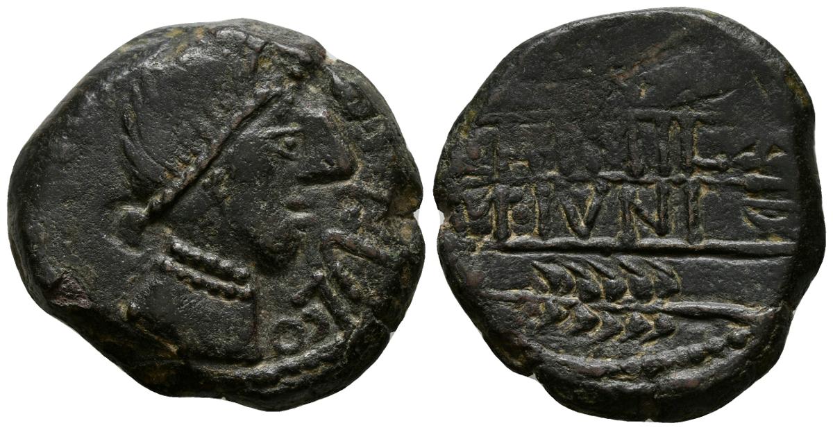 OBULCO. As. 220-20 a.C. Porcuna (Jaén). A/ Cabeza femenina con collar a derecha, delante leyenda interna OBVLCO. R/ Arado y espiga a izquierda, entre ellos, separados por líneas inscripciones L.AIMIL y M.IVNI, a su derecha de arriba hacia abajo AID. FAB-1807. Ae. 14,65g. MBC-.