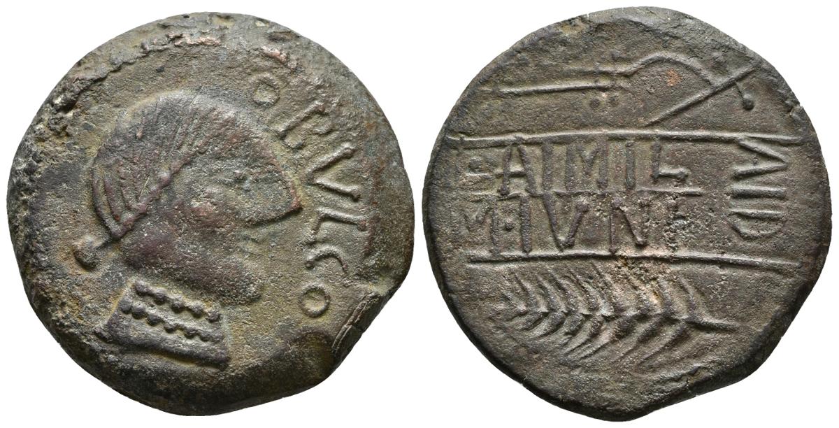 OBULCO. As. 220-20 a.C. Porcuna (Jaén). A/ Cabeza femenina a derecha, delante OBVLCO. R/ Leyenda L. AIMIL./M. IVNI./AID. entre arado y espiga. FAB-1812. Ae. 16,62g. MBC+.