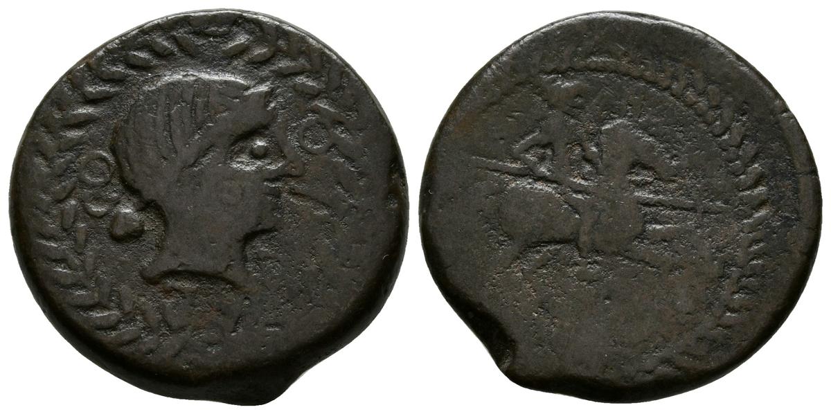 OBULCO. Semis. 220-20 a.C. Porcuna (Jaén). A/ Cabeza femenina a derecha, delante OBUL-CO todo dentro de laurea. R/ Jinete con lanza a derecha dentro de láurea. FAB-1830; ACIP. 2182. Ae. 7,80g. MBC-/BC+.