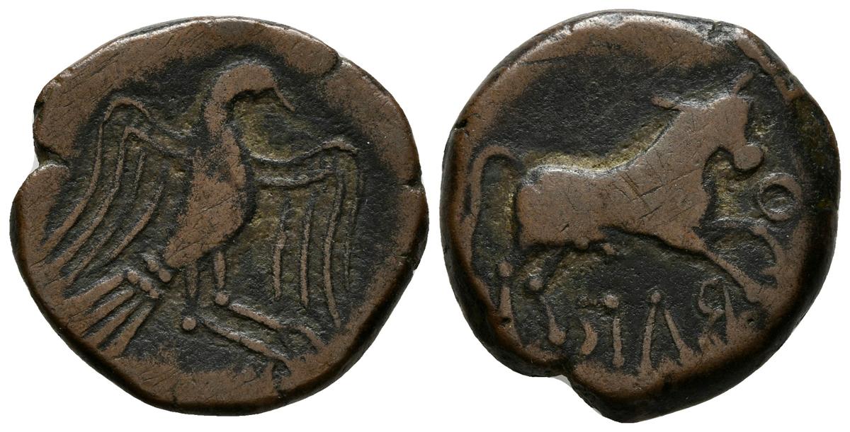 OBULCO. Semis. 220-20 a.C. Porcuna (Jaén). A/ Aguila explayada a derecha. R/ Toro a derecha, debajo leyenda OBVLCO en lectura interior. FAB-1850. Ae. 6,93g. MBC-.
