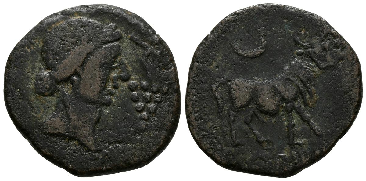 ORIPPO. As. 50 a.C. Dos Hermanas (Sevilla). A/ Cabeza a derecha, delante racimo de uvas. R/ Toro andando a derecha, encima creciente y debajo ORIPPO. FAB-1903. Ae. 9,01g. MBC-.