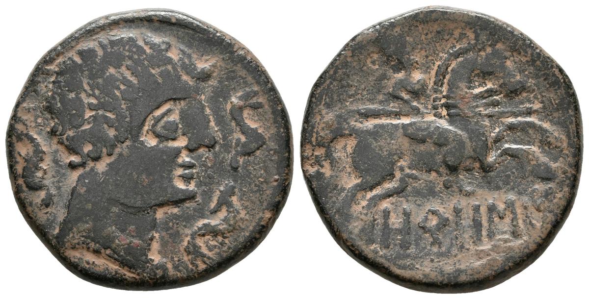 OROSIS. As. 120-20 a.C. Zona media del Ebro. A/ Cabeza masculina a derecha rodeada de tres delfines. R/ Jinete con lanza a derecha, debajo OROSI. FAB-1907. Ae. 9,74g. MBC.