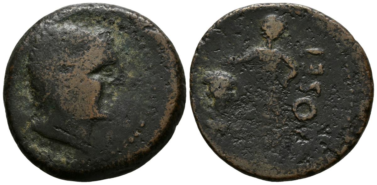 OSET. As. 120-20 a.C. San Juan de Aznalfarache (Sevilla). A/ Cabeza a derecha. R/ Genio de pie con racimo de uvas a izquierda a la derecha OSSET. FAB-1947. Ae. 14,67g. BC+. Escasa.