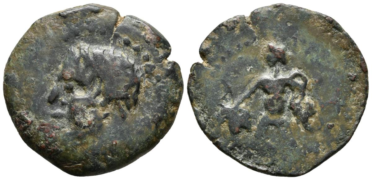 OSET. As. 120-20 a.C. San Juan de Aznalfarache (Sevilla). A/ Cabeza masculina a izquierda. R/ Genio en pie con racimo de uvas a izquierda, detrás (OSET). FAB-1948. Ae. 10,94g. MBC-.