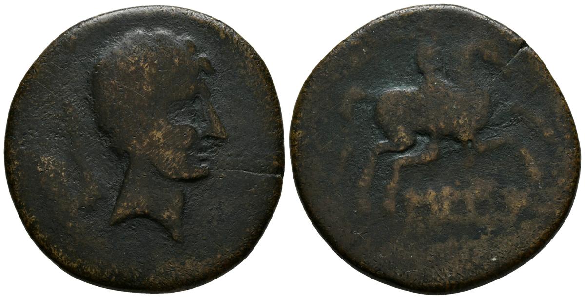 SAITI. ¿Dupondio?. 120-20 a.C. Xátiva (Valencia). A/ Cabeza masculina a derecha, detrás ¿Hacha?. R/ Jinete con palma a derecha, debajo SAITi. FAB-No cita. Ae. 21,39g. 37mm. BC. Muy rara.