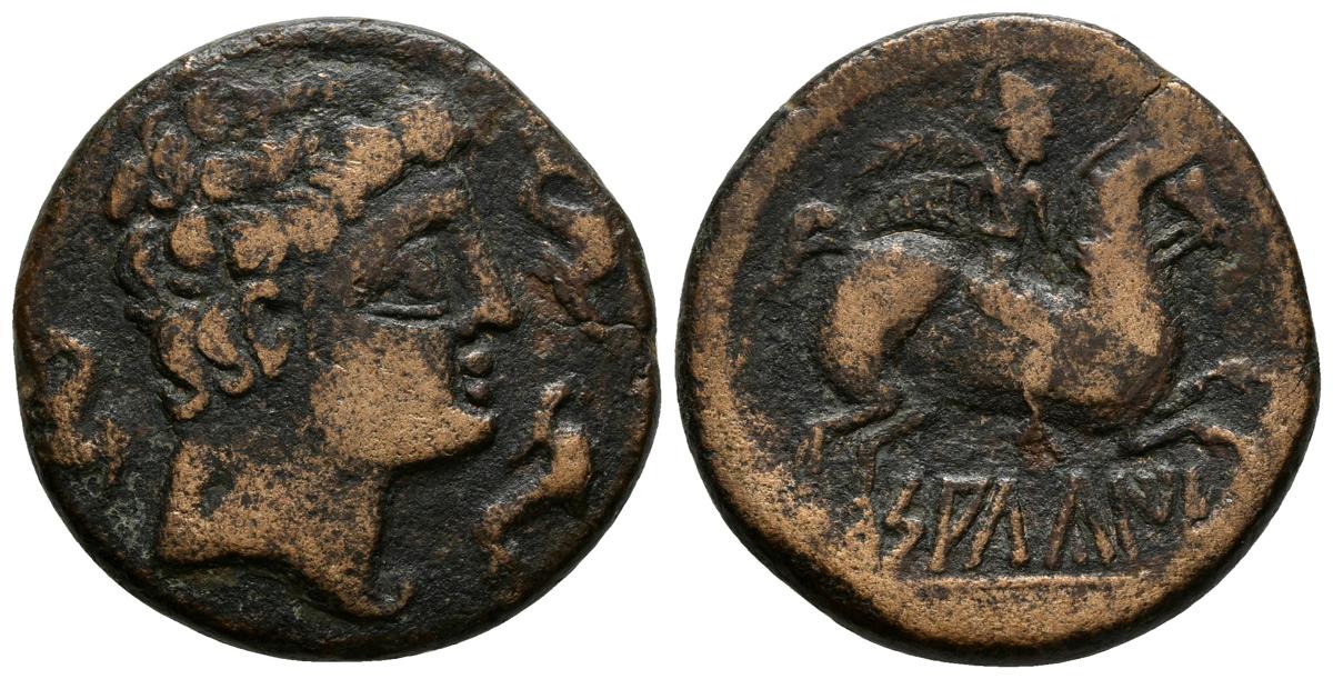 SALDUIE. As. Zaragoza. A/ Cabeza masculina a derecha, rodeada de tres delfines. R/ Jinete con palma a derecha, debajo SALDuIE. FAB-305. Ae. 10,86g. MBC-.