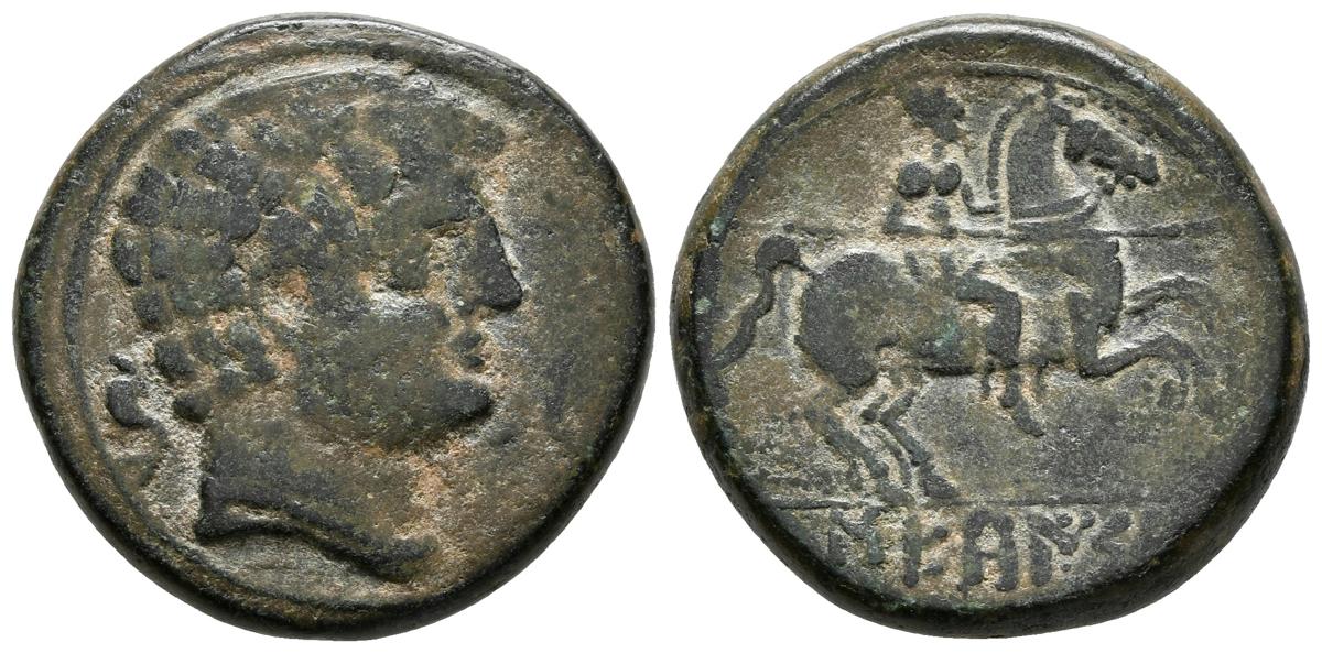 SECAISA. As. 120-20 a.C. Segeda (Aragón). A/ Cabeza masculina a derecha entre dos delfines. R/ Jinete con lanza a derecha, debajo SECaISA. FAB-2133. Ae. 11,87g. MBC+/EBC-.