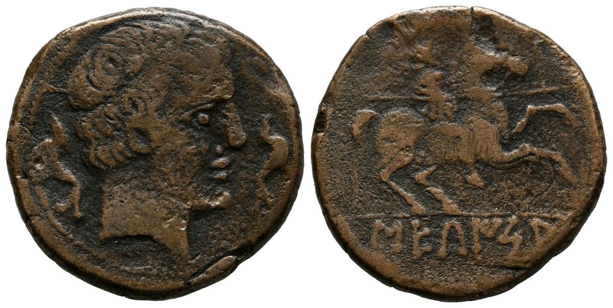 SECAISA. As. 120-20 a.C. Segeda (Aragón). A/ Cabeza masculina a derecha entre dos delfines. R/ Jinete con lanza a derecha, leyenda ibérica curva SECaISA. FAB-2137. Ae. 9,30g. MBC-.
