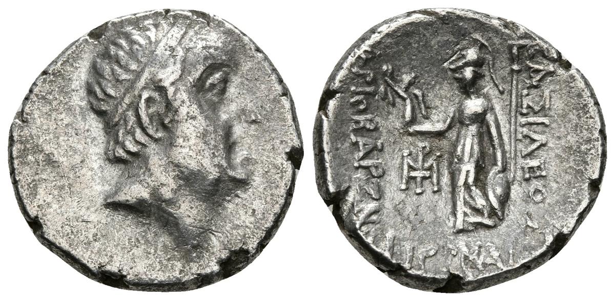 REYES DE CAPPADOCIA. Ariobarzanes I Philoromaios. Dracma. 96-63 a.C. A/ Cabeza con diadema de Ariobarzanes a derecha. R/ Athena estante a izquierda con lanza y escudo, esta sostiene Victoria. Monograma a la izquierda AI. Simonetta 17c; HGC 7, 850. Ar. 3,23g. MBC+.