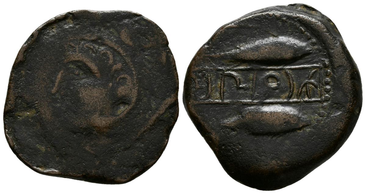 SEXI. As. 200-20 a.C. Almuñecar (Granada). A/ Cabeza de Hércules con piel de león a izquierda, detrás clava. R/ Dos atunes a derecha, encima letra púnica Alef, entre ambos y dentro de cartela leyenda púnica. FAB-2227. Ae. 10,50g. BC+/MBC+.