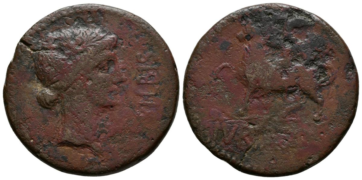 TURIASO. As. 50-20 a.C. Tarazona (Zaragoza). A/ Cabeza femenina a derecha, delante SILBIS. R/ Jinete con cetro marchando a izquierda, debajo TVRIASO. FAB-2434. Ae. 10,99g. BC+/BC. Muy escasa.