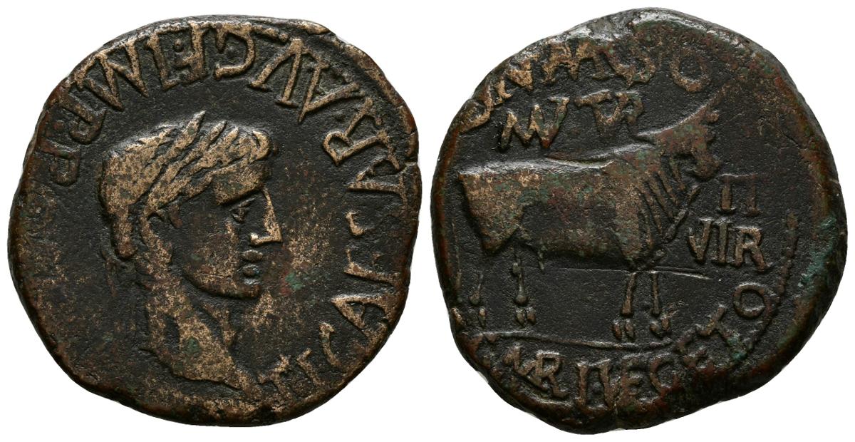 TURIASO. As. Epoca de Tiberio. 14-36 a.C. Tarazona (Zaragoza). A/ Cabeza con láurea de Augusto a derecha. TI.CAESAR.AVG.F.IMP.PONT.M. R/ Toro parado a derecha, encima MVN. TVR. delante II VIR. y alrededor M. PONT. MARSO.-C. MARI. VEGETO. FAB-2450. Ae. 10,89g. MBC.