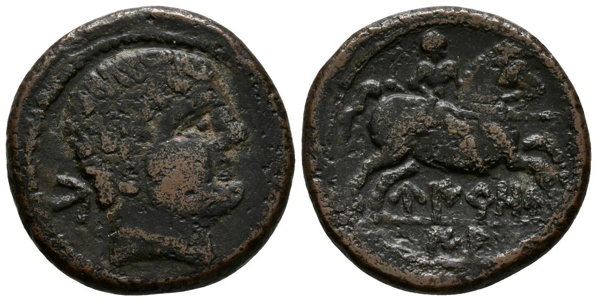 UIROUIAS. As. 120-20 a.C. Borobia (Soria). A/ Cabeza masculina a derecha, detrás letra ibérica U. R/ Jinete con lanza a derecha, debajo UIRO/IAS con línea de separación. FAB-2481. Ae. 7,43g. MBC-. Muy escasa.