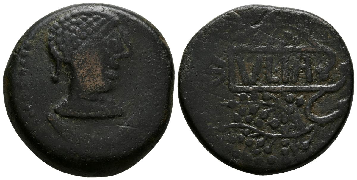 ULIA. As. 50 a.C. Montemayor (Córdoba). A/ Cabeza femenina a derecha, delante palma y debajo creciente. R/ Ramas de vid alrededor de cartela, VLIA. FAB-2490. Ae. 18,66g. MBC-.