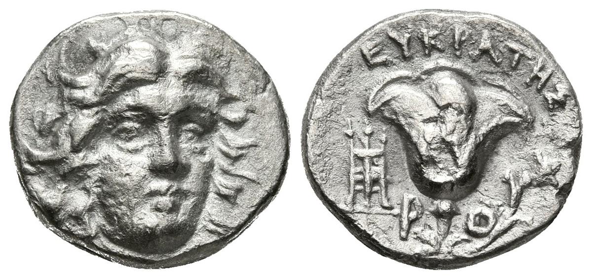 RHODOS, Rhodas. Dracma. 229-205 a.C. Eukrates. A/ Cara de Helios ligeramente a derecha. R/ Rosa con yema a su derecha, a su izquierda trípode, a ambos lados P-O. Ashton 225; SNG Keckman 559.60. Ar. 2,60g. MBC.