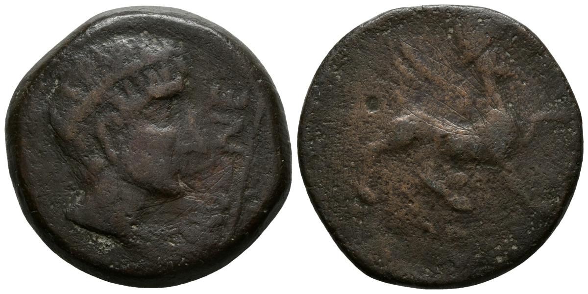 URSONE. As. 50 a.C. Osuna (Sevilla). A/ Cabeza masculina a derecha, delante URSONE subrayada. R/ Esfinge a derecha, debajo entre líneas L.AP.DEC.Q.F. FAB-2499. Ae. 19,94g. MBC-/BC.