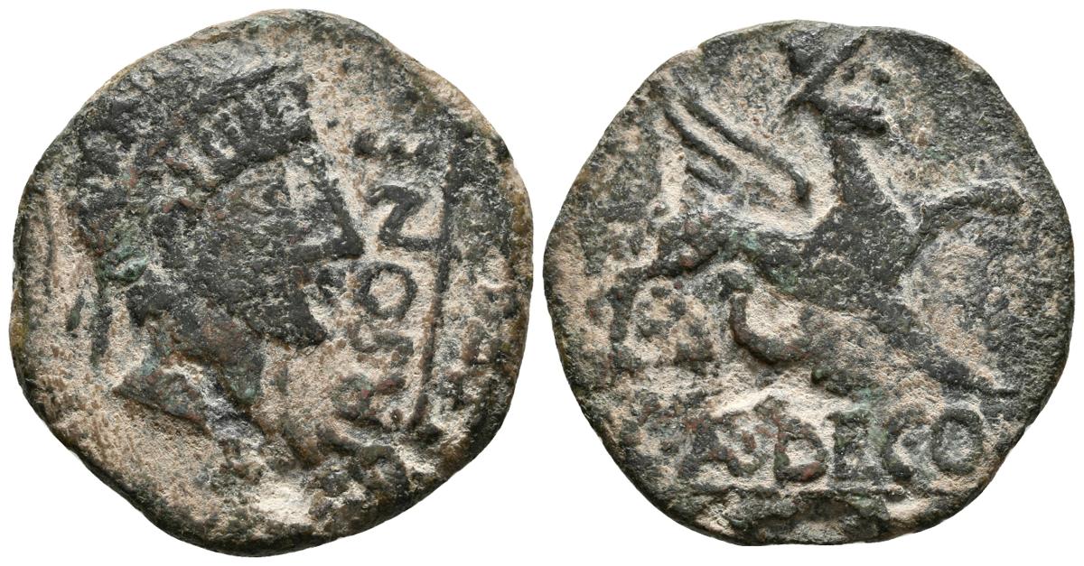 URSONE. As. 50 a.C. Osuna (Sevilla). A/ Cabeza masculina a derecha, delante URSONE subrayada. R/ Esfinge a derecha, debajo entre líneas L.AP.DEC.Q.F. FAB-2499. Ae. 11,80g. MBC-/MBC.