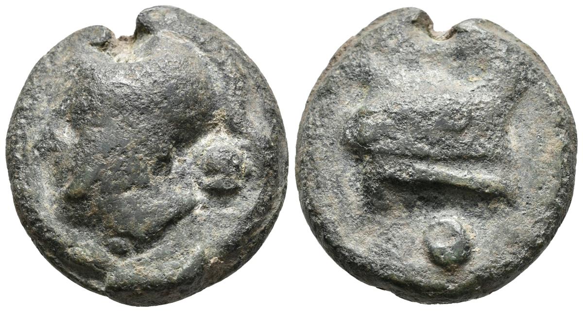 ACUÑACIONES ANONIMAS. Aes Grave. Uncia. 225-217 a.C. Roma. A/ Cabeza de Marte-Minerva a izquierda, detrás un punto. R/ Proa de nave a derecha, debajo un punto. Craw 35.6; ICC 83; HN Italy 342. Ae. 23,03g. MBC-. Rara.