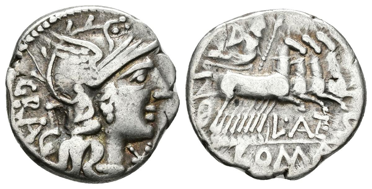 L. ANTESTIUS GRAGULUS. Denario. 136 a.C. Roma A/ Cabeza de Roma a derecha, bajo el mentón signo de valor y detrás leyenda GRAC. R/ Júpiter en cuádriga a derecha con cetro y haz de rayos. Debajo leyenda L. ANTES, en exergo ROMA. Craw 238.1. Ar. 3,87g. MBC-.