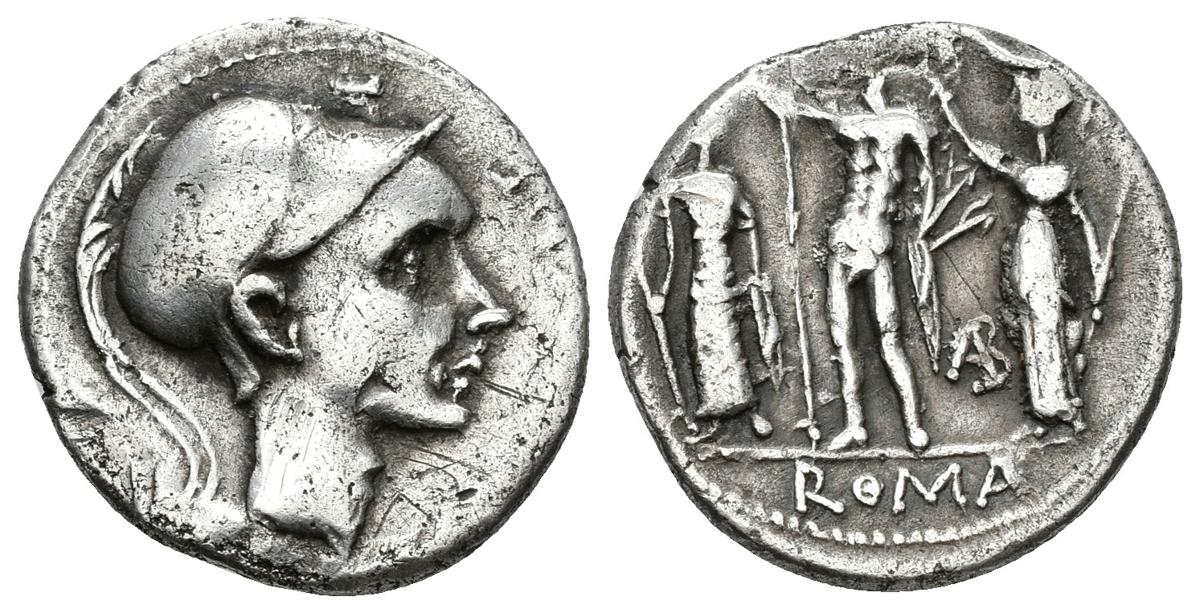 CN. CORNELIUS BLASIO. Denario. 112-11 a.C. Roma. A/ Busto de Escipión el africano a derecha, encima estrella, detrás símbolo proa, leyenda (CN BLASIO C)N F. R/ Júpiter con lanza y látigo con Juno a su derecha con cetro y Minerva que esta coronándole. En el campo marca monetaria, en el exergo ROMA. Craw 296.1. Ar. 3,75g. MBC-.