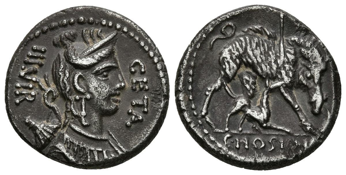 C. HOSIDIUS GETA. Denario. 68 a.C. Roma. A/ Busto diademado de Diana a derecha, con arco y carcaj sobre su espalda, leyenda GETA III VIR. R/ Jabalí a derecha atravesado por una flecha y atacado por un perro. En el exergo C. HOSIDI CF. Craw 407.2. Ar. 3,76g. EBC-.
