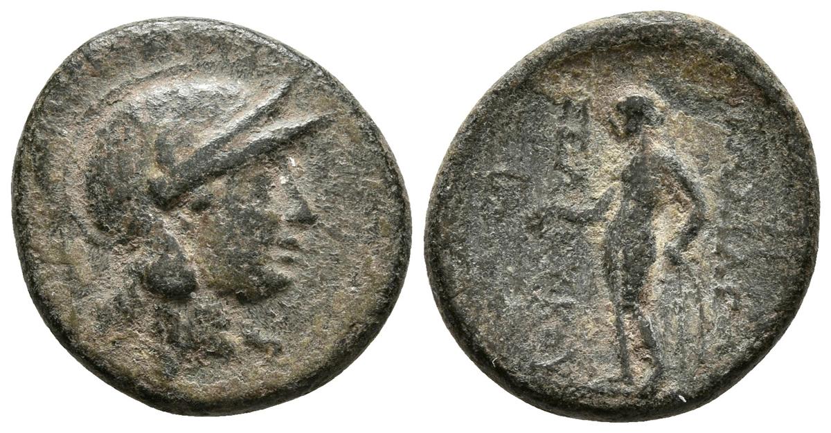 SELEUKOS II Kallinikos. Sardeis. 246-226 a.C. Reino Seleucida. A/ Cabeza de Athena con casco a derecha. R/ Apolo estante portando arco y flechas. SC 660.2; HGC 9, 345. Ae. 4,12g. MBC-.