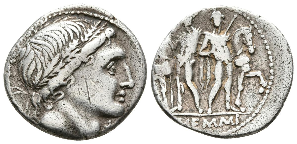 L. MEMMIUS. Denario. 109-108 a.C. Sur de Italia. A/ Busto varonil, probablemente Apolo, laureado con una corona de roble a derecha, delante signo de valor. R/ Los dioscuros de pie mirando de frente y sosteniendo las bridas de sus caballos, en el exergo L.MEMMI. Craw 304.1. Ar. 3,83g. MBC.