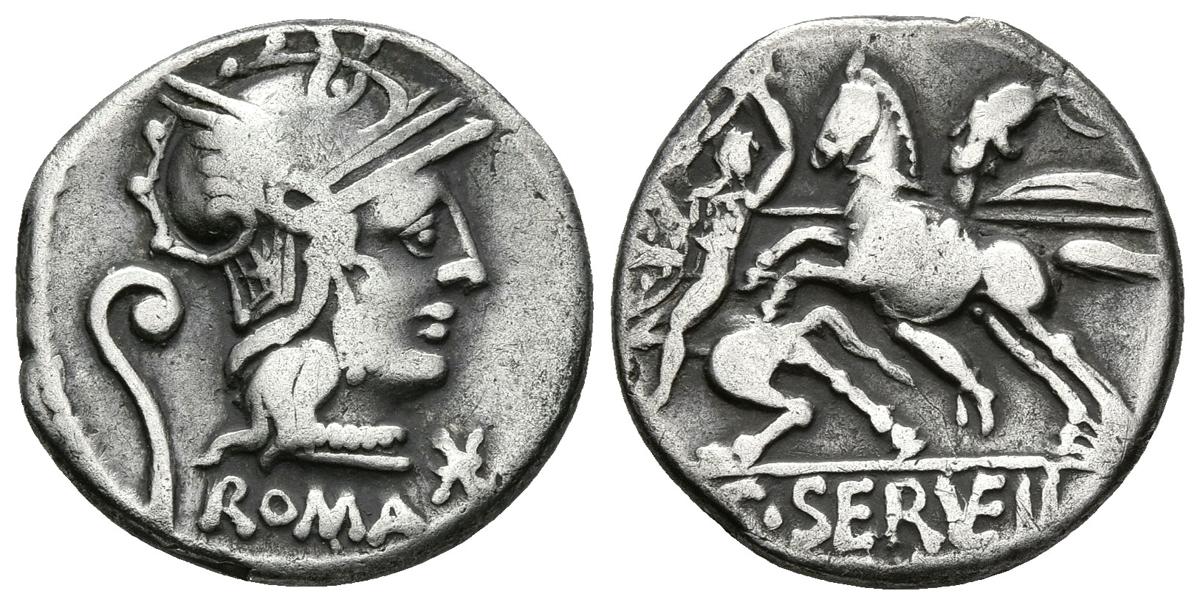 C. SERVILIUS. Denario. 127 a.C. Roma. A/ Busto de Roma a derecha, delante signo de valor y detrás lituus, debajo ROMA. R/ Batalla a caballo entre dos guerreros, el escudo del jinete de la derecha inscrito (M), en exergo C·SERVEIL. Craw 264.1. Ar. 4,08g. MBC-.
