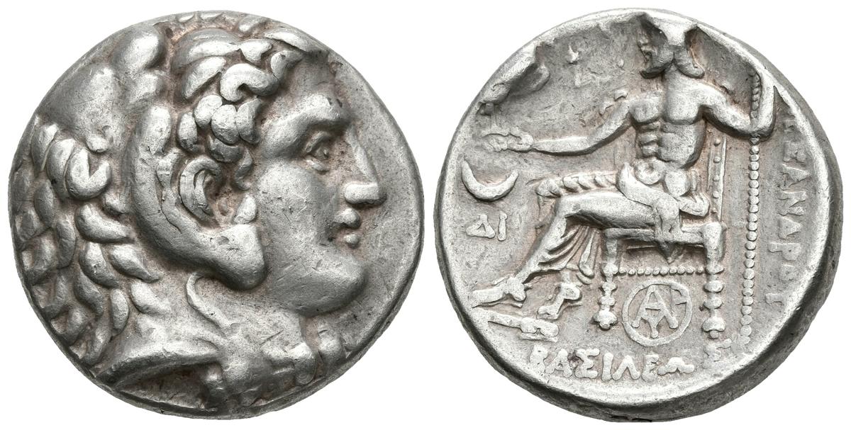 SELEUKOS I NIKATOR. Tetradracma. 310-290 a.C. Reino Seleucida. Karrhai. A/ Cabeza de Herakles con piel de león a derecha. R/ Zeus sedente a izquierda portando cetro y águila, delante creciente y AI, debajo de trono monograma. Price 3818. Ar. 17,05g. MBC+.