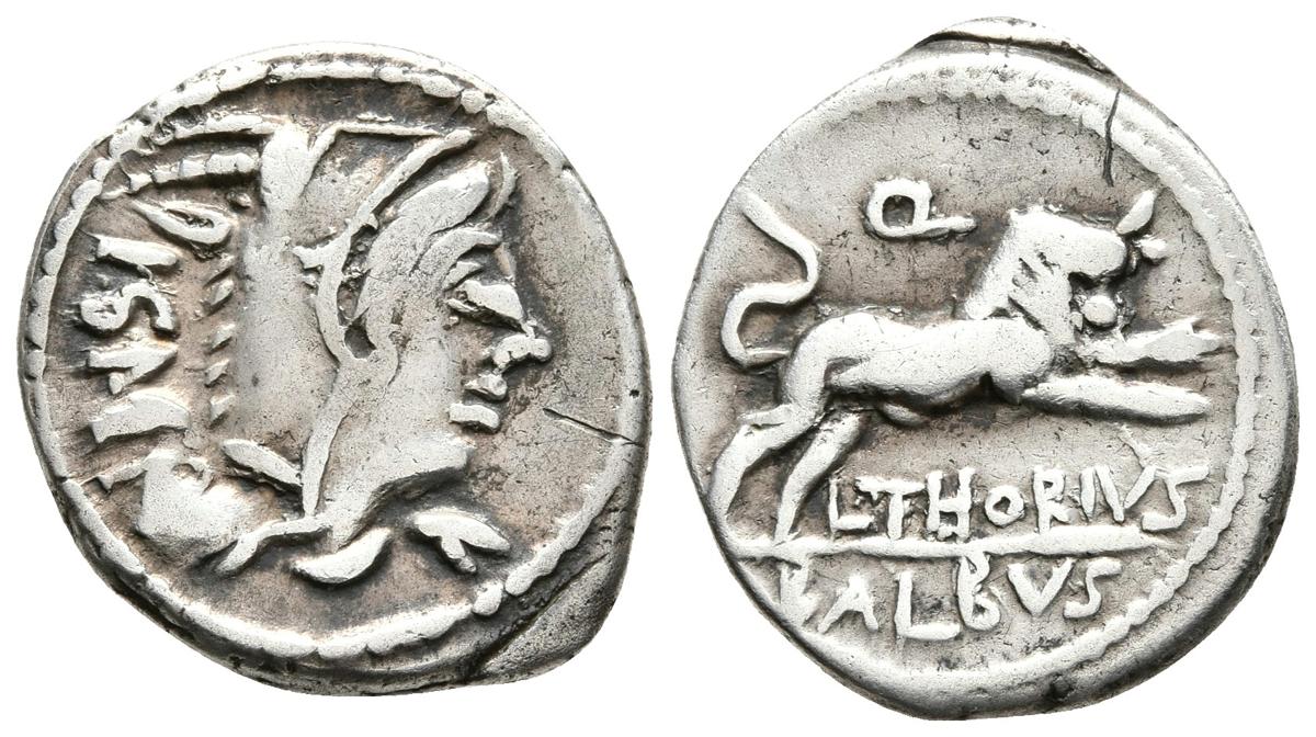 L. THORIUS BALBUS. Denario. 105 a.C. Roma. A/ Busto de Juno Sospita a derecha, cubierta con piel de cabra, detrás I·S·M·R. R/ Toro a derecha con las patas delanteras levantadas, encima A y debajo L.THORIUS, en el exergo BALBUS. Craw 316.1; Sydenham 598; Thoria 1; RBW 1168var. Ar. 3,88g. MBC-.