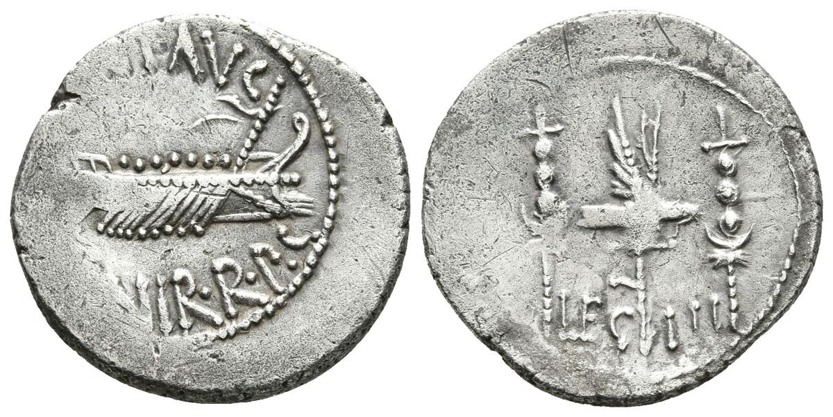MARCO ANTONIO. Denario. 32-31 a.C. Ceca móvil junto a Marco Antonio. A/ ANT. AVG. III VIR. R. P. C. Galera pretoriana a derecha. R/ LEG. III. Aguila legionaria entre dos insignias militares. Craw 544.15; RSC 28. Ar. 3,20g. MBC+/MBC.