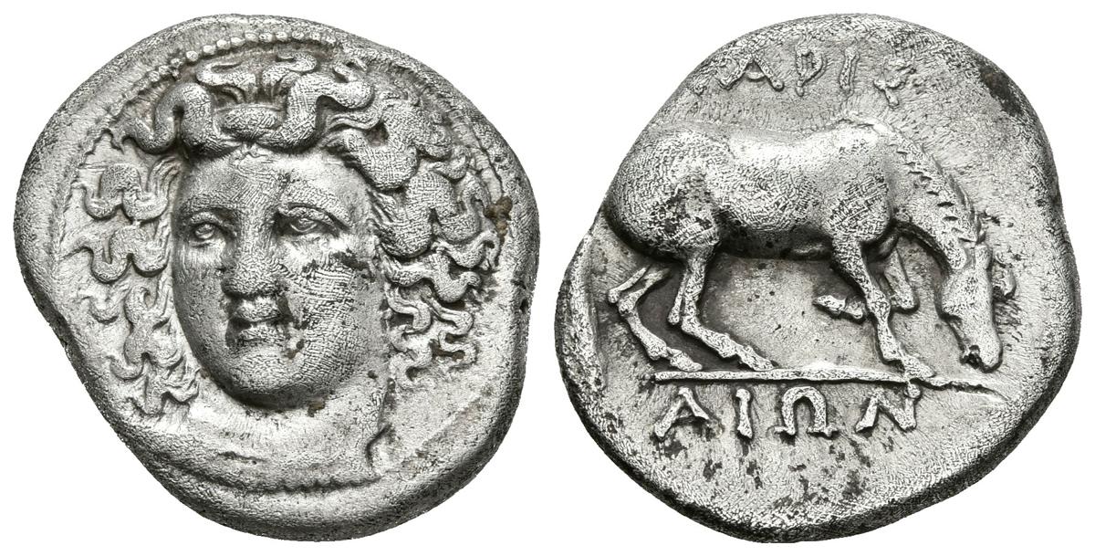 THESSALIA, Larissa. Dracma. 365-356 a.C. A/ Cabeza de la ninfa Larissa ligeramente hacia la izquierda, en el cabello ampyx. R/ Caballo parado a derecha, preparándose para acostarse. Phase L-III, 57; BCD Thessaly II 319. Ar. 5,84g. MBC.
