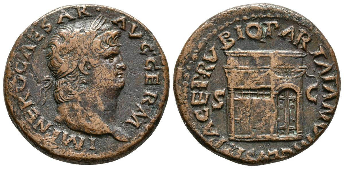 NERON. As. 54-68 a.C. Roma. A/ Cabeza laureada a derecha. IMP NERO CAESAR AVG GERM. R/ Templo de Jano a derecha, decorado con ventana enrejada, guirnaldas y puertas dobles cerradas. PACE P R VBIQ PARTA IANVM CLVSIT, a ambos lados S C. RIC I 309; WCN 289. Ae. 9,52g. MBC/MBC+.