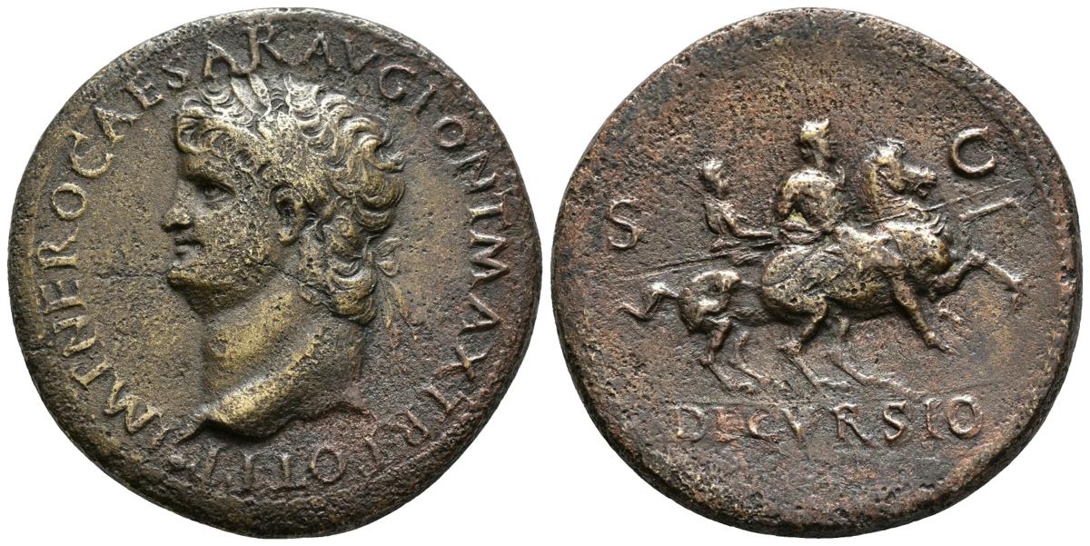 NERON. Sestercio. 67 d.C. Lugdunum. A/ Busto laureado a izquierda. IMP NERO CAESAR AVG P MAX TR P P P. R/ Nerón montado a caballo marchando a la derecha, usando túnica corta y sosteniendo lanza, detrás soldado portando vecillum sobre el hombro, a ambos lados S C. RIC I 508; WCN 448; Lyon 187. Ae. 22,79g. MBC/MBC-