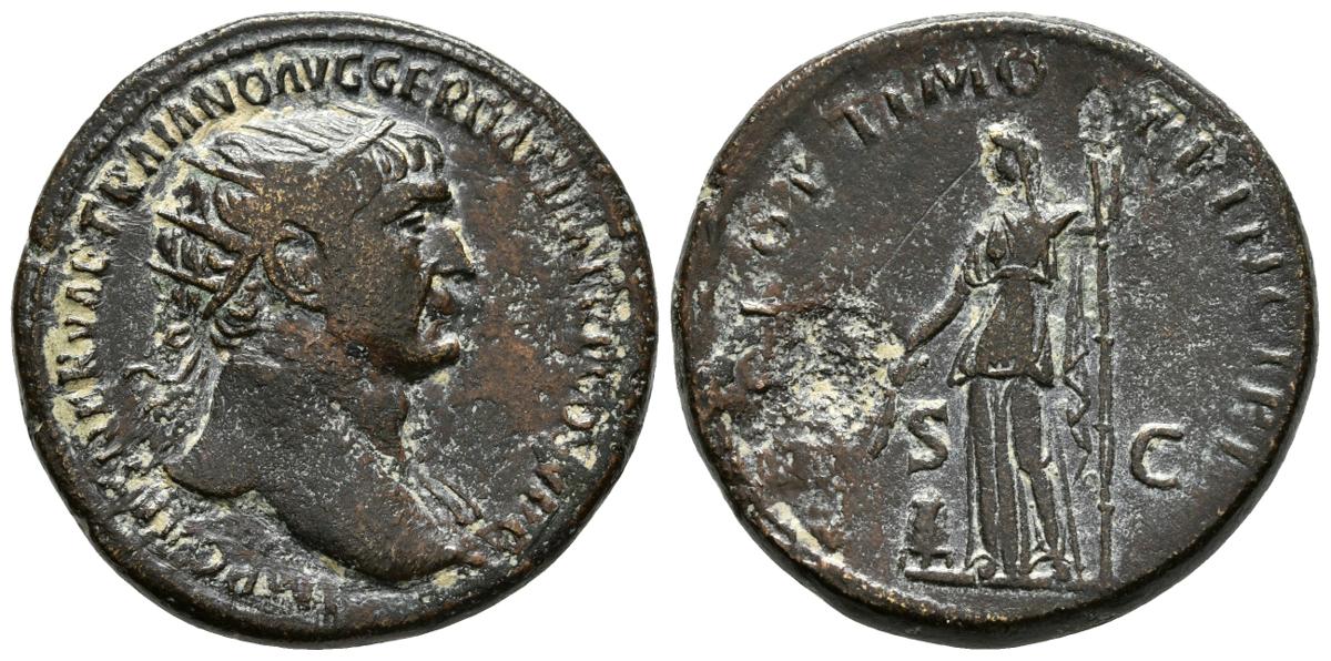 TRAJANO. Dupondio. 98-117 d.C. Roma. A/ Busto radiado a derecha. IMP CAES NERVAE TRAIANO AVG GER DAC P M TR P COS V P P. R/ Ceres estante a izquierda portando cetro y espigas de trigo sobre modio. S P Q R OPTIMO PRINCIPI, en exergo S C. Woytek 241b. Ae. 12,53g. MBC.