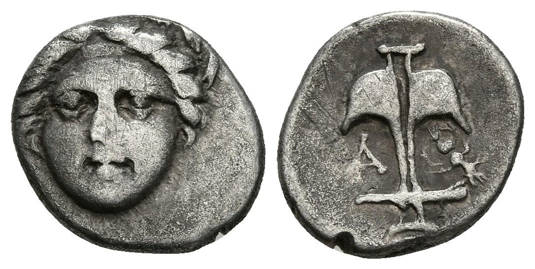 APOLLONIA PONTIKA, Thracia. Dióbolo. Finales del siglo V-IV a.C. A/ Apolo. R/ Ancla, a izquierda A y a derecha cangrejo de río. SNG BM 167. Ar. 1,20g. MBC-/MBC.