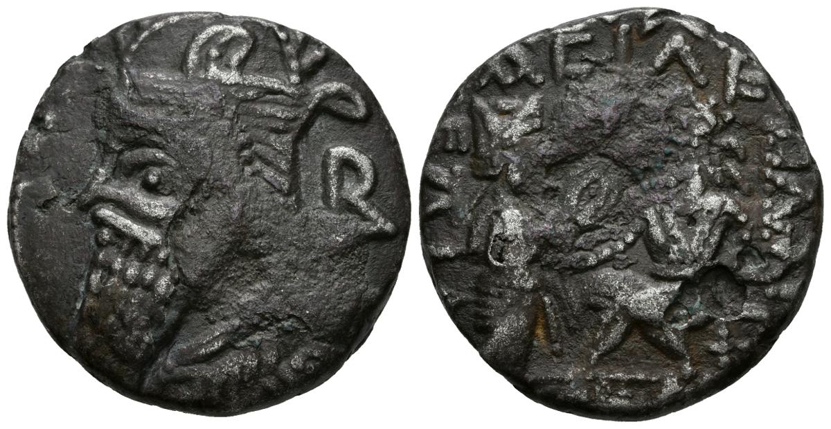 VOLOGASES VI. Tetradracma. 208-228 a.C. Reyes de Parthia. Seleukeia en el Tigris. A/ Busto barbado a izquierda con tiara, detrás B. R/ Vologases entronizado a izquierda, recibiendo la diadema de Tyche en pie a izquierda. Sellwood 84.124var. Ar. 9,16g. MBC.