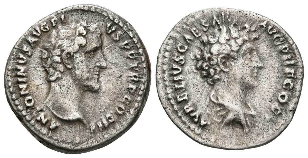 ANTONINO PIO Y MARCO AURELIO. Denario. 140 d.C. Roma. A/ Busto a derecha. ANTONINVS AVG PIVS P P TR P COS III. R/ Busto drapeado a derecha. AVRELIVS CAESAR AVG PII COS. RIC 415b (Pius). Ar. 3,30g. MBC.
