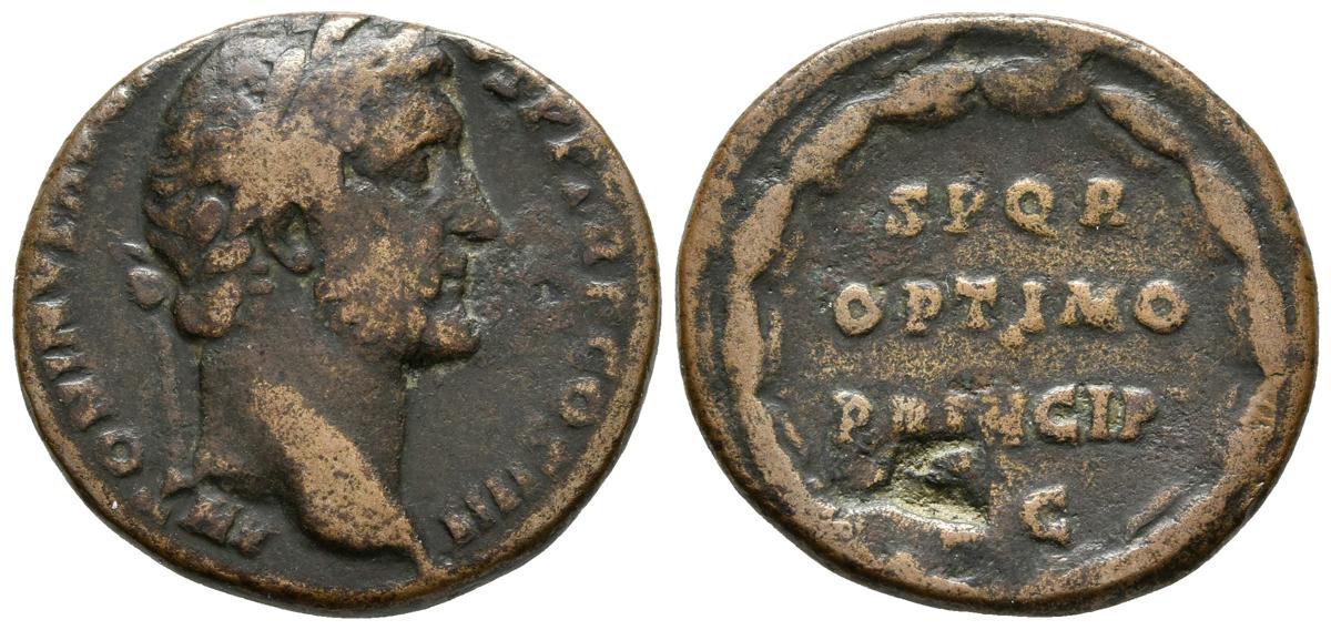 ANTONINO PIO. As. 147 d.C. Roma. A/ Busto laureado a derecha. ANTONINVS AVG PIVS T P TR P COS IIII. R/ S P Q R/OPTIMO/PRINCIPI/S-C dentro de corona de laurel. BMC 1762; Cohen 791; RIC 827a. Ae. 9,11g. MBC-.
