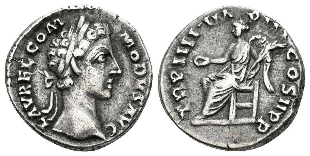 COMODO. Denario. 179 d.C. Roma. A/ Busto laureado a derecha. L AVREL COMMODVS AVG. R/ Victoria sedente a izquierda portando pátera y palma. TR P IIII IMP III COS II P P. BMC 801; Cohen 775; RIC 666. Ar. 3,48g. MBC+.