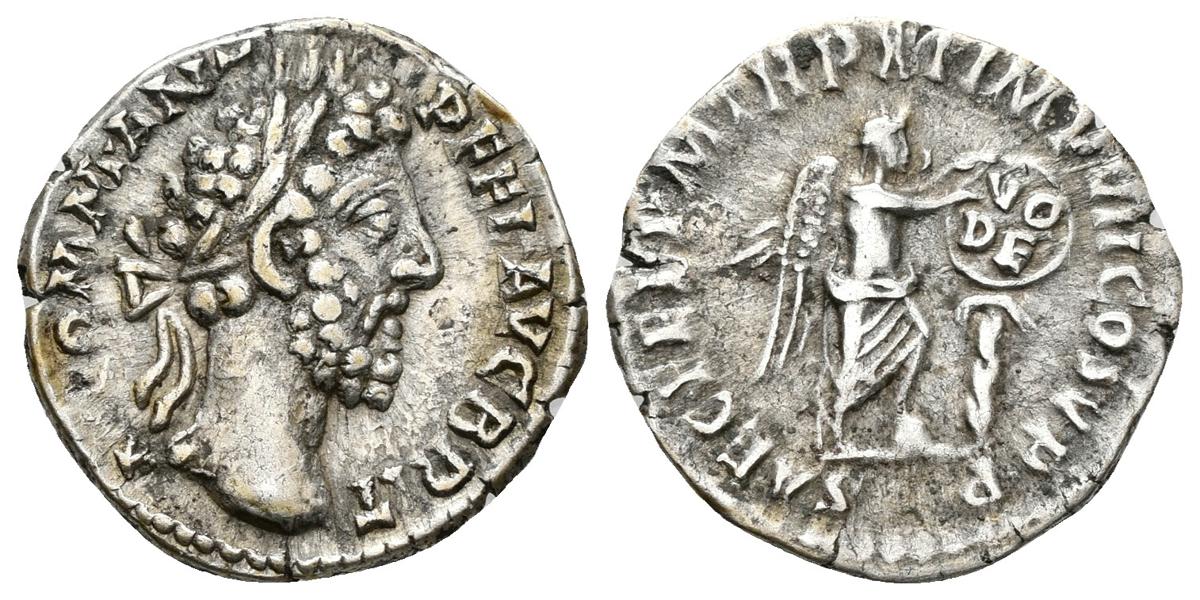 COMODO. Denario. 185 d.C. Roma. A/ Busto laureado a derecha. M COMM ANT P FEL AVG BRIT. R/ Victoria estante a derecha con pie apoyado sobre casco, delante escudo sobre palma, en el escudo inscrito VO-DE, alrededor SAEC FEL P M TR P XI IMP VII COS V P P. RIC 136. Ar. 2,49g. MBC.