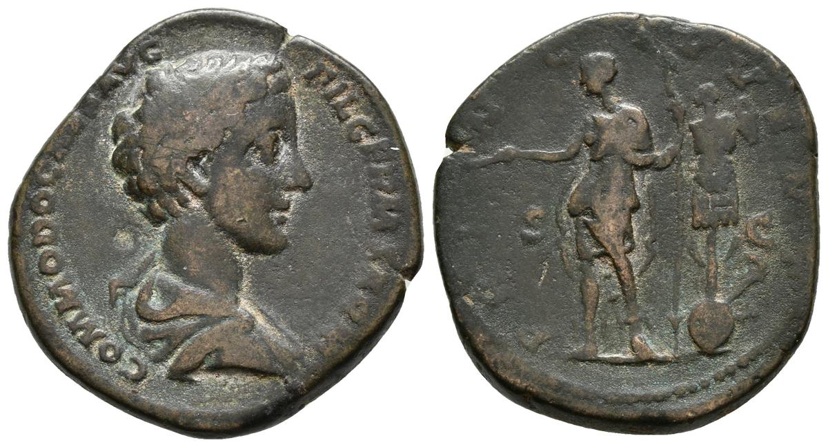 COMODO. As. 172-173 d.C. Roma. A/ Busto drapeado a derecha. COMMODO CAES AVG FIL GERM SARM. R/ Cómodo estante a izquierda portando rama y lanza, a la derecha trofeo. PRINC IVVENT, en exergo S C. RIC 1542; C. 615; BMC 1535. Ae. 9,32g. MBC-. Escasa.