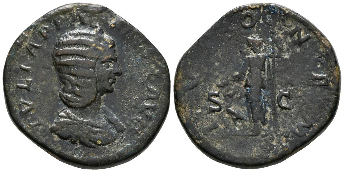 JULIA DOMNA. Sestercio. 211-215 d.C. Roma. A/ Busto drapeado a derecha. IVLIA PIA FELIX AVG. R/ Juno estante a izquierda portando cetro y pátera, a sus pies pavo real. IVNONEM, en exergo SC. RIC 585b (Caracalla); BMCRE 210 (Caracalla). Ae. 23,51g. MBC-. Escasa.