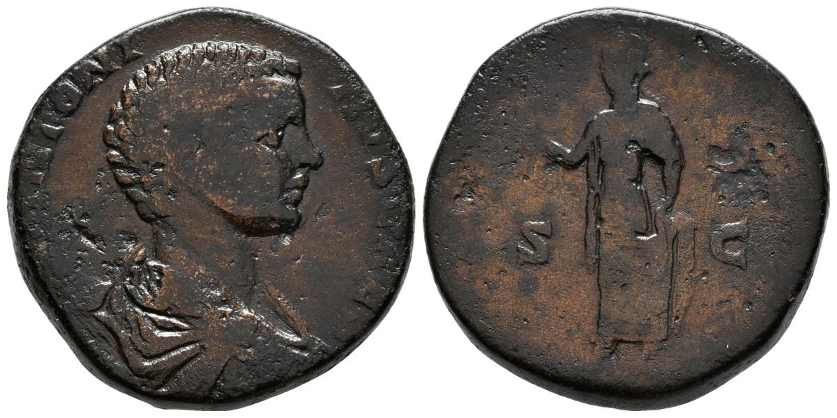 CARACALLA. Sestercio. 211-217 d.C. Roma. A/ Busto drapeado con coraza a derecha. M AVR ANTONINVS CAES. R/ Spes con flor avanzando a izquierda. SPEI PERPETVAE, en exergo S C. RIC 401; BMC 613; Cohen 595. Ae. 22,19g. MBC-/BC. Escaso.