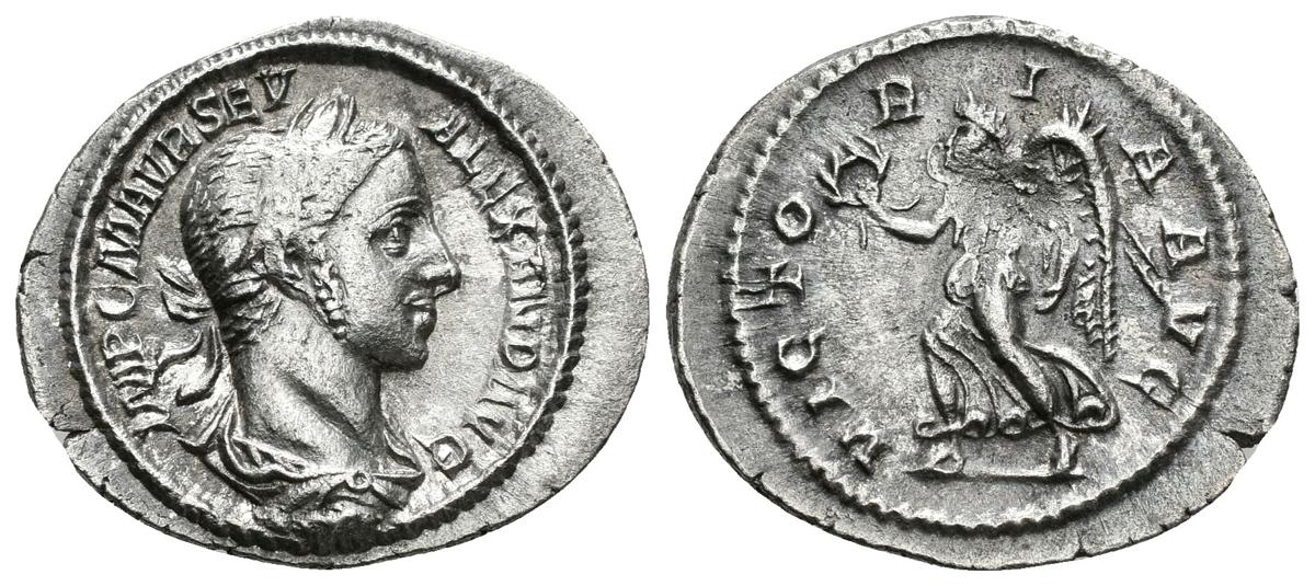 ALEJANDRO SEVERO. Denario. 222-235 d.C. Roma. A/ Busto laureado a derecha. IMP C M AVR SEV ALEXAND AVG. R/ Victoria avanzando a izquierda con corona y palma. VICTORIA AVG. RIC IV 180; BMCRE 268; RSC 564. Ar. 2,31g. MBC.