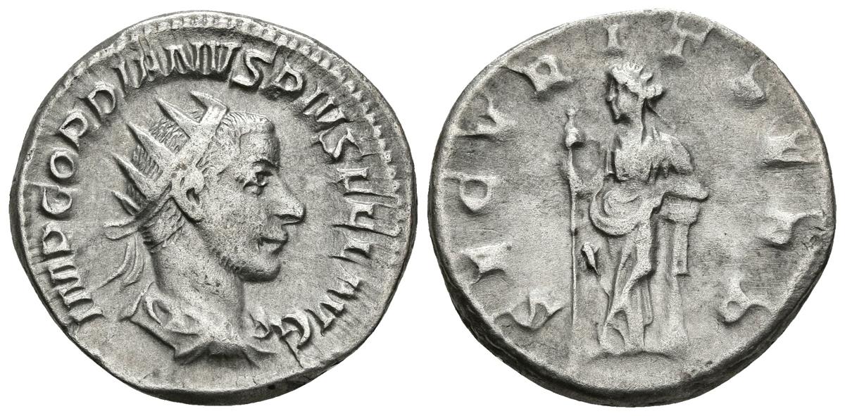 GORDIANO III. Antoniniano. 238-244 d.C. Roma. A/ Busto radiado y drapeado con coraza a derecha. IMP GORDIANVS PIVS FEL AVG. R/ Securitas estante a izquierda apoyada sobre columna y portando cetro. SECVRIT PERP. RIC 151. Ar. 5,15g. MBC-.