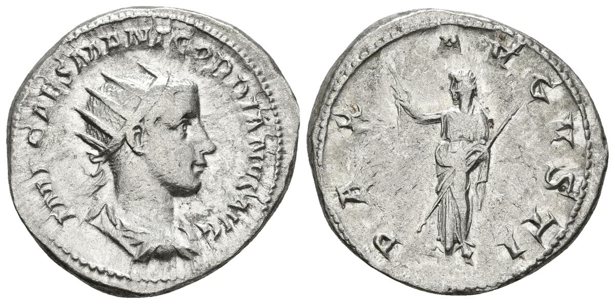 GORDIANO III. Antoniniano. 238-244 d.C. Roma. A/ Busto radiado y drapeado con coraza a derecha. IMP CAES M ANT GORDIANVS AVG. R/ Pax estante a izquierda portando rama y cetro. PAX AVGVSTI. RIC 3; RSC 173. Ar. 5,60g. MBC+.